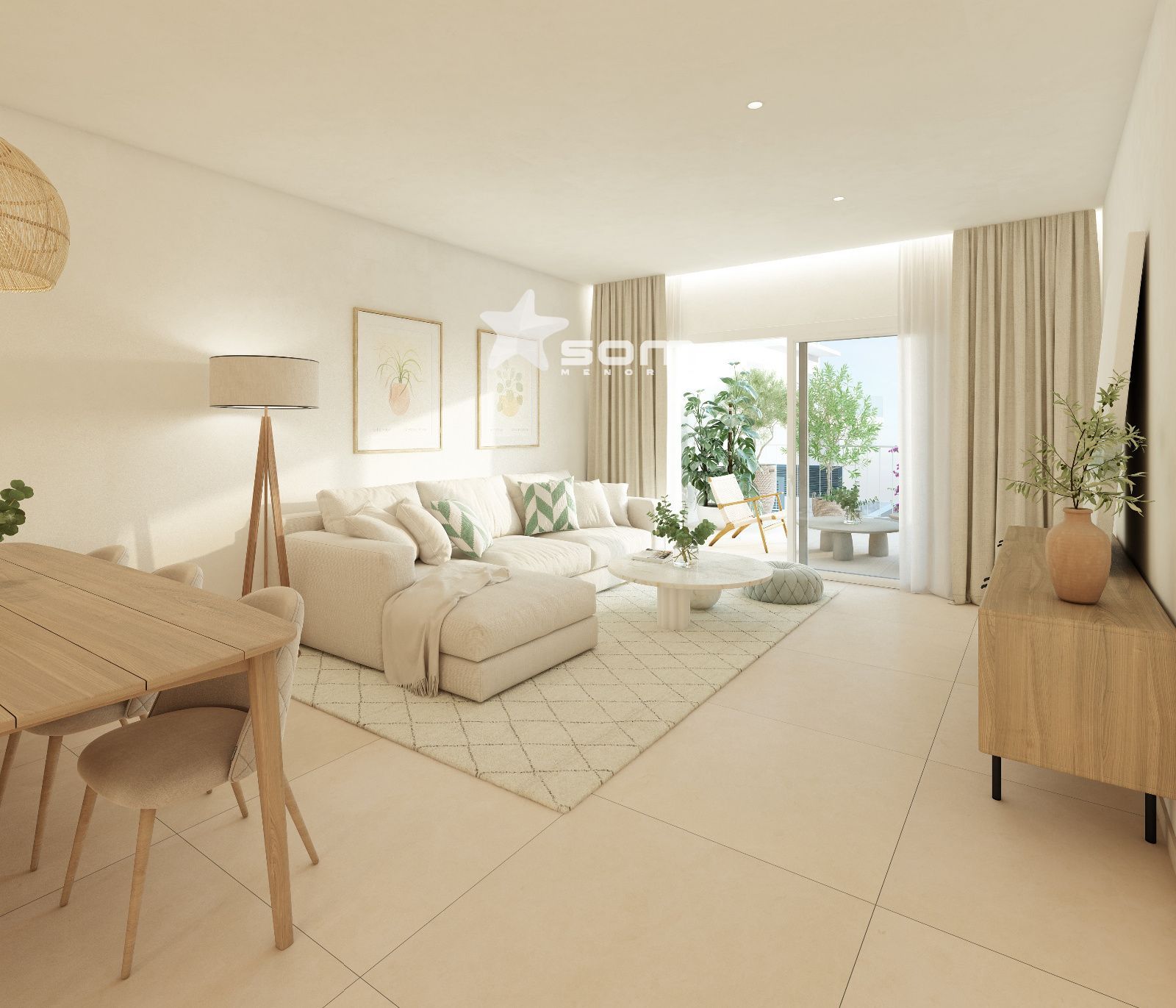 Amplio y luminoso apartamento en planta baja. Consta de un amplio salón comedor con cocina abierta totalmente amueblada y equipada y salida la gran terraza privada parcialmente cubierta, dos grandes dormitorios con armarios empotrados y dos baños completos (uno en-suite). Climatización por aerotermia.